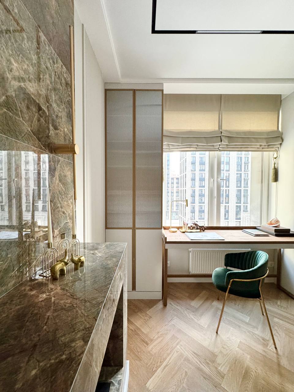 Очень люблю дизайн кварцпаркет «Дуб Карельский» — он стал базой в нескольких проектах. Также использовала штучный паркет, особенно нравится маленький формат — он даёт рандомность и глубину. Сейчас жду появления французской ёлки — это модный тренд, и хочется его где-то применить.