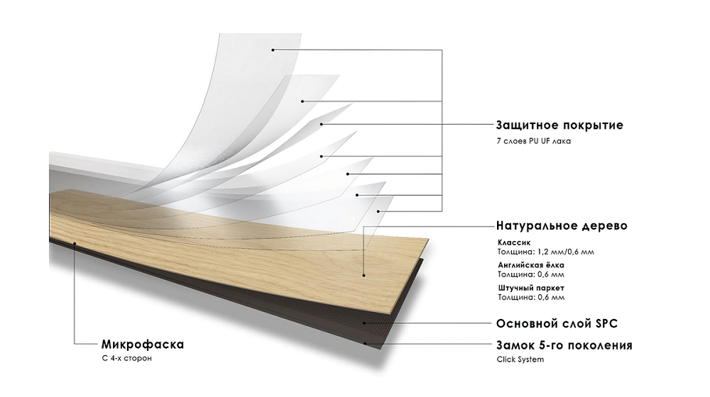 Кварцпаркет (каменная основа + натуральное дерево + 7 слоев прочного лака) — это жёсткое и стабильное напольное покрытие, где верхний слой дерева стабилизирует каменная плита.