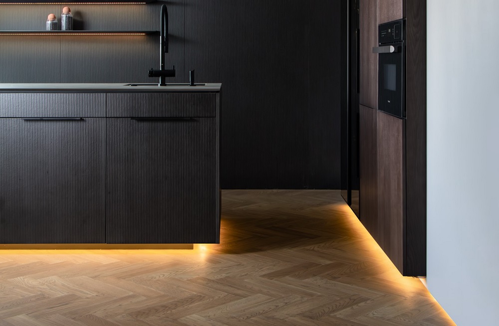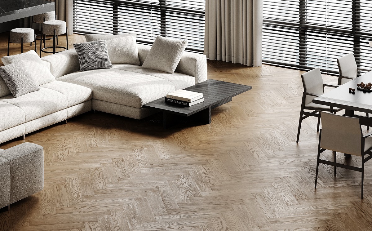 Настоящий подарок для создания стильного интерьера — возможность беспороговой укладки. Дизайнеры очень любят укладку без швов и порогов английской ёлочкой, это создаёт особую общую атмосферу всего пространства, при этом позволяет оформить комнаты в разных стилях.