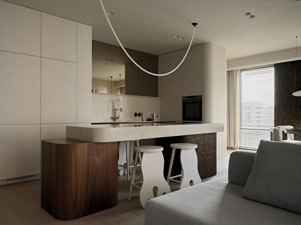 Основная задача — сохранить планировку, но полностью изменить ощущение пространства с помощью мягкой геометрии, продуманного света и правильных материалов.