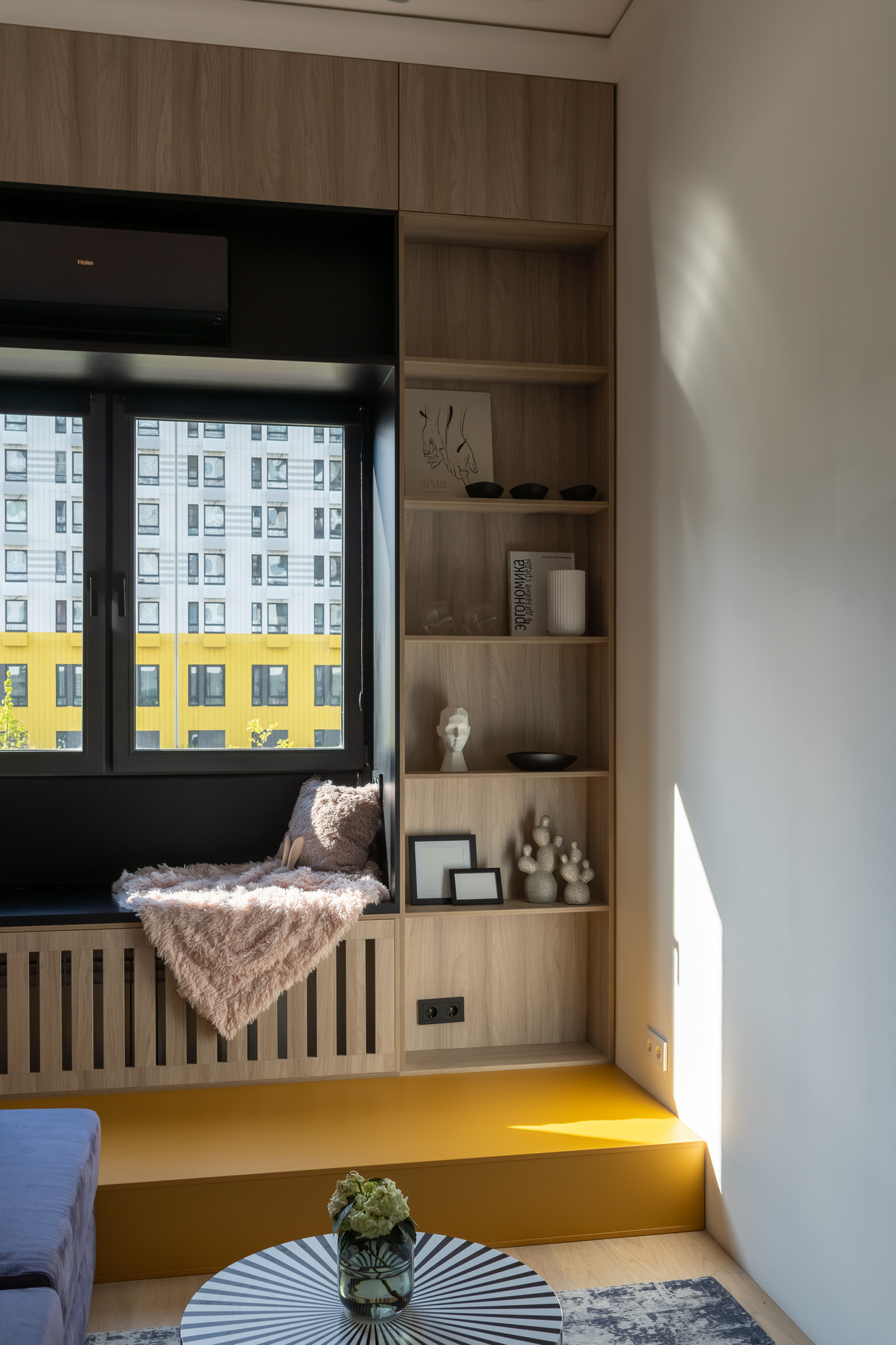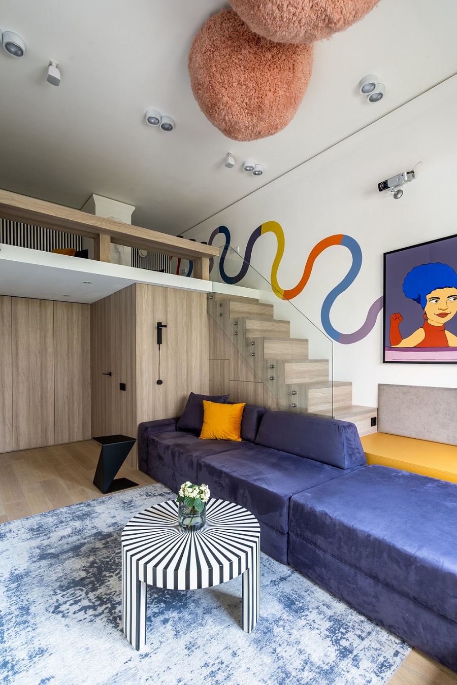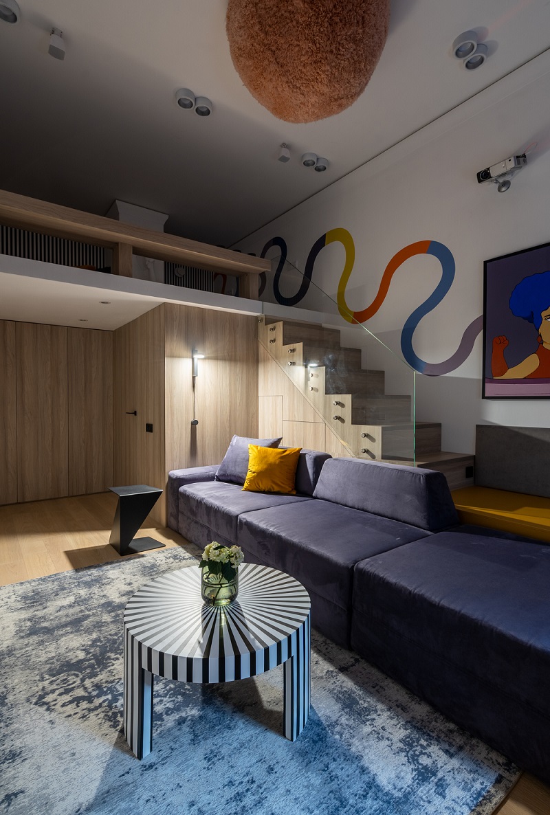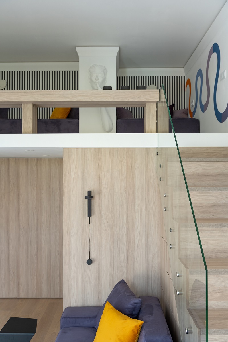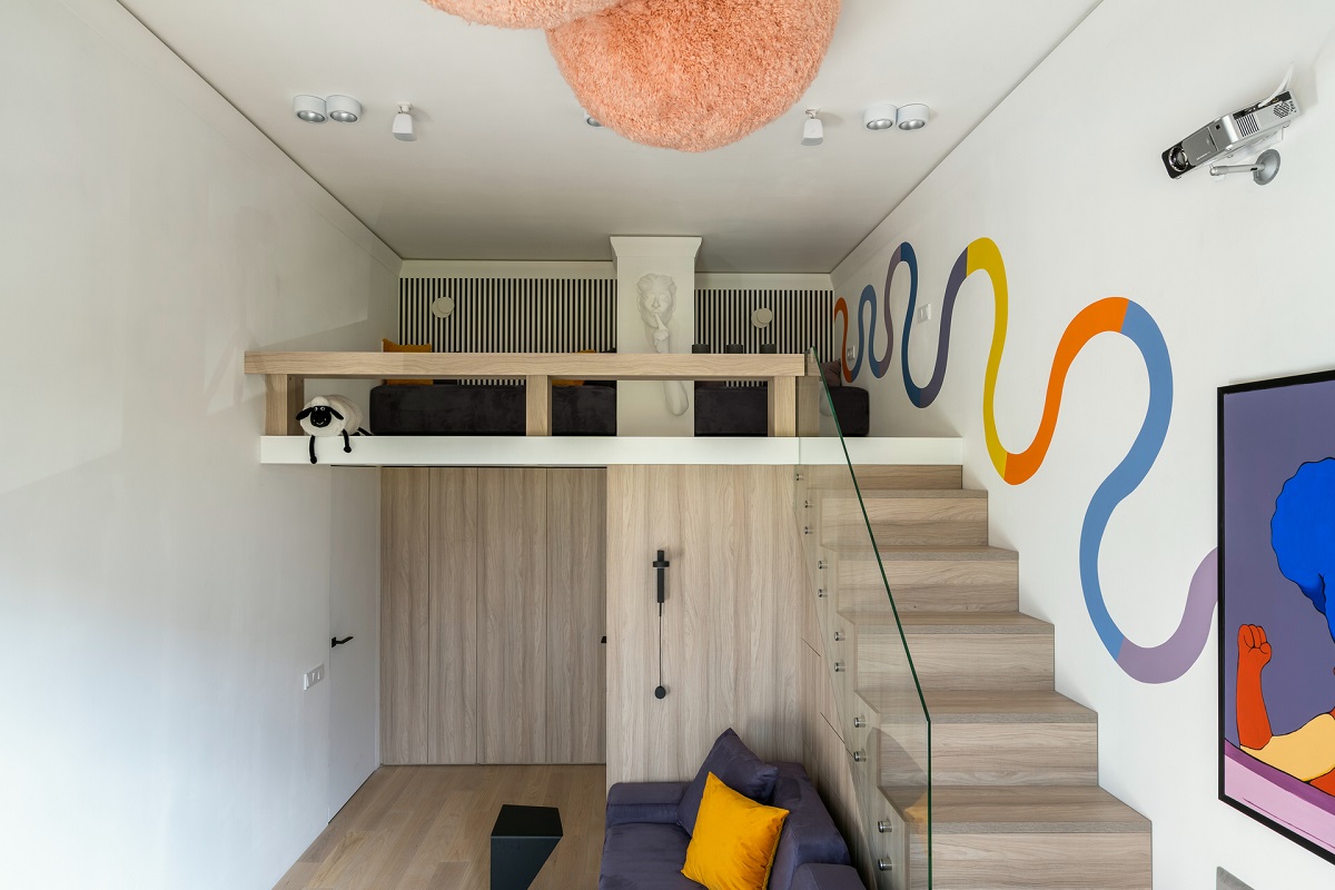 Дизайнеры использовали высоту потолка в 3,67 м и увеличили площадь гостиной почти в два раза! С появлением второго этажа открылись и новые возможности: дополнительное место для хранения, подиум у окна и лестница.