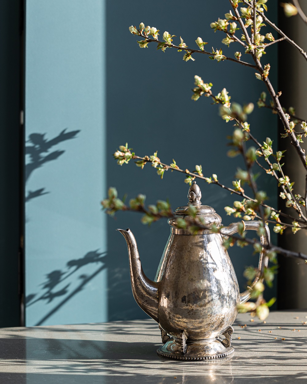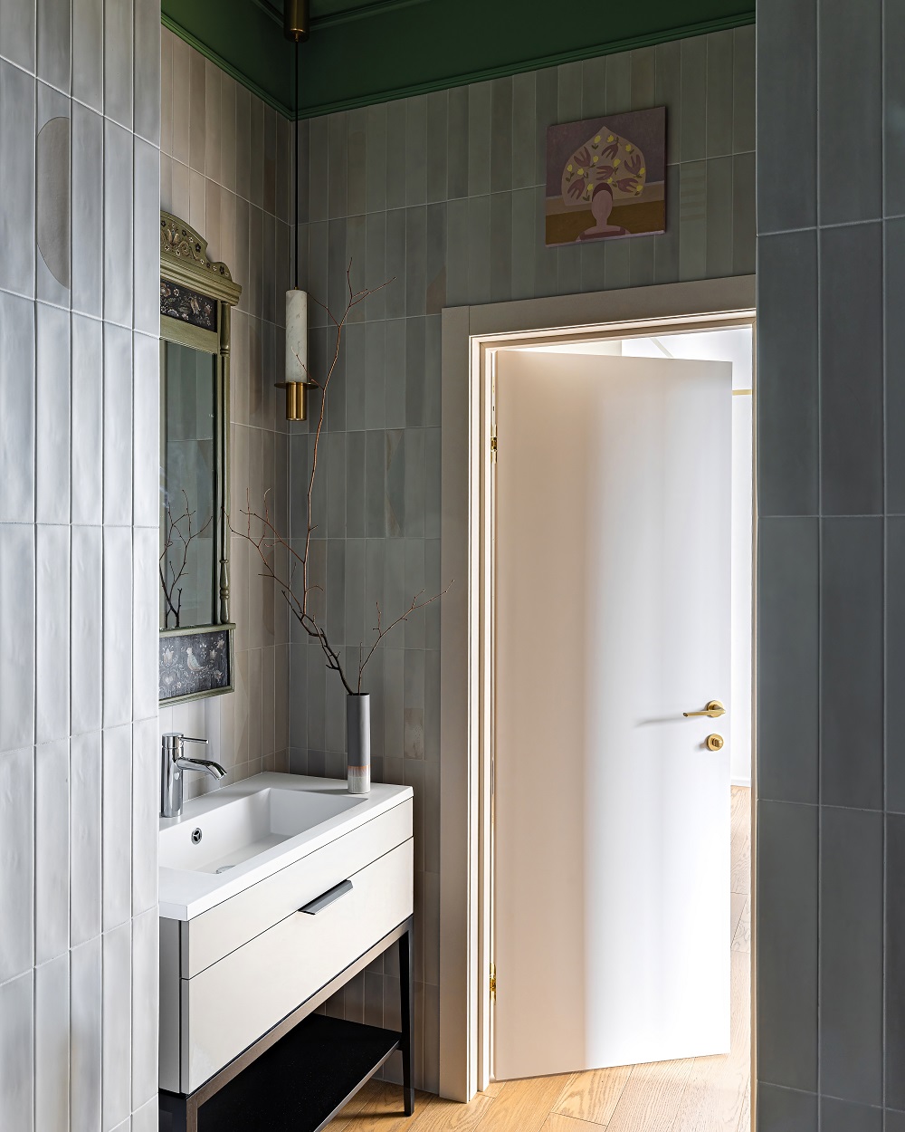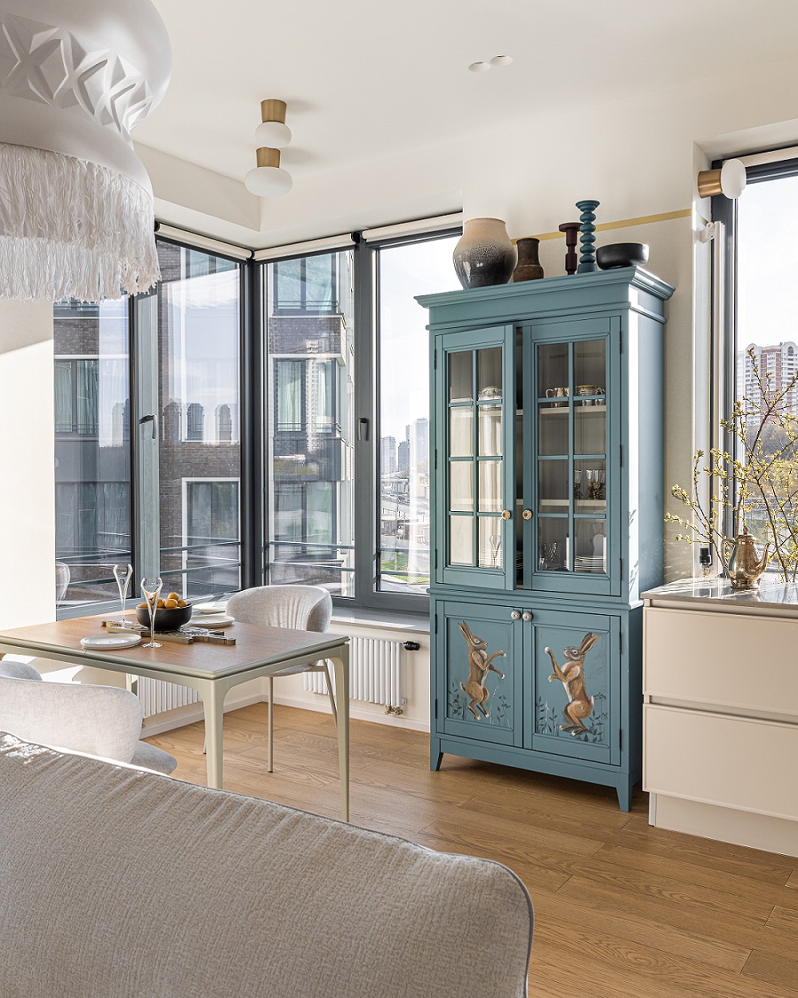 Часть художественных работ, иконы, винтажный чайный сервиз из серебра сразу были ангажированы в проект из семейной коллекции. В процессе создания интерьера дизайнер подобрала еще несколько художественных работ, керамические изразцы, зеркало с домовой росписью. Большое внимание уделено предметной среде: здесь много уникальной мебели локальных российских брендов.